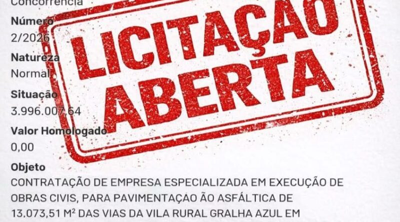 A Prefeitura de Guaraci já definiu a data da licitação para a pavimentação da Vila Rural Urbanizada: 20 de fevereiro. O processo vai contratar a empresa responsável pela obra, com investimento estimado em cerca de R$ 4 milhões.