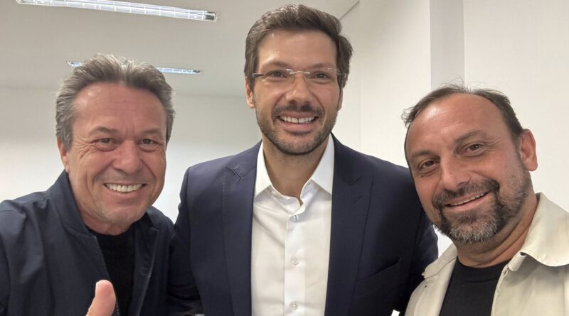 Prefeito de Lobato, Fábio Chicaroli (à direita), ladeado pelo secretário estadual da Agricultura, Marcio Nunes (à esquerda) e pelo prefeito de Londrina, Tiago Amaral.