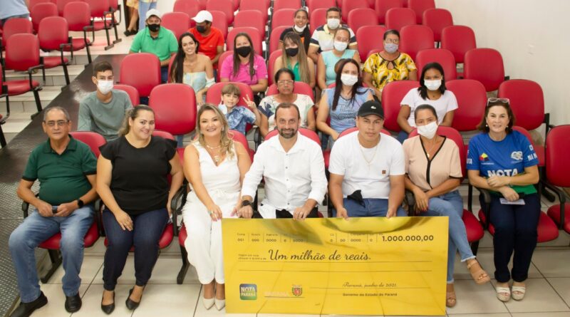 A cerimônia de entrega aconteceu na Casa da Cultura, no município de Lobato – PR e o cheque simbólico foi entregue ao lobatense Giovane Honório de Lima pela Auditora Fiscal da Secretaria de Estado da Fazenda e Coordenadora Geral do Programa Nota Paraná, Marta Gambini, pelo prefeito de Lobato, Fábio Chicaroli, primeira dama e Secretária de Assistência Social, Fabíola de Oliveira Gazoni Chicaroli, vereadores, secretários municipais e autoridades.