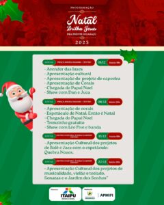 Cláudio Júnior, enfatiza que a visitação a Casa do Papai Noel estará disponível até o dia 23 de dezembro, todas as sextas-feiras e sábados, das 19h às 22h. No ano passado, a Casa do Papai Noel recebeu mais de 5 mil visitantes. “Estamos preparando uma programação toda especial, com shows de corais, artistas locais, bandas, espetáculos de teatro, musical, trenzinho, todos os finais de semana à noite na Praça Central Ângelo Baggio”, enfatiza.