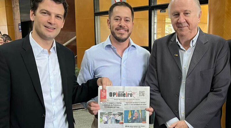 Na capital paranaense, o prefeito de Santa Fé, Fernando Brambilla (ao centro), posou para uma foto especial na manhã desta quarta-feira, (05/04), ao lado do presidente da CNM (Confederação Nacional dos Municípios) Paulo Ziulkoski (à direita da foto) e do vice-prefeito de Curitiba e secretário de Estado das cidades, Eduardo Pimentel.