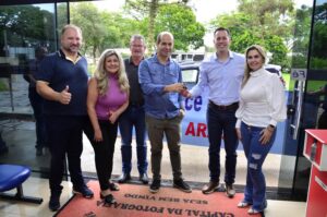 O prefeito Fernando Brambilla, acompanhado do vereador Reginaldo Thenan e dos representantes de entidades, recebe a chave do veículo das mãos do deputado estadual Evandro Araújo.
