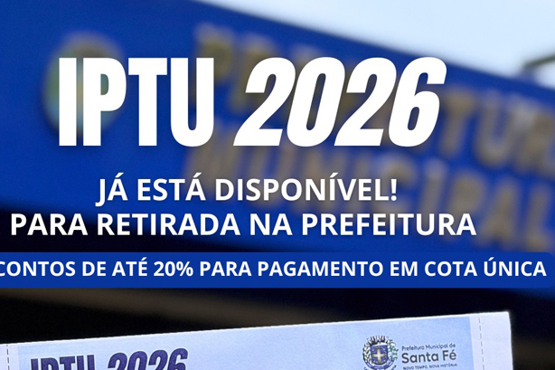 A Prefeitura de Santa Fé informa que os carnês do IPTU 2026 já estão disponíveis para retirada diretamente na Prefeitura Municipal. Os contribuintes que optarem pelo pagamento em cota única poderão obter desconto de até 20%, conforme o calendário estabelecido.
